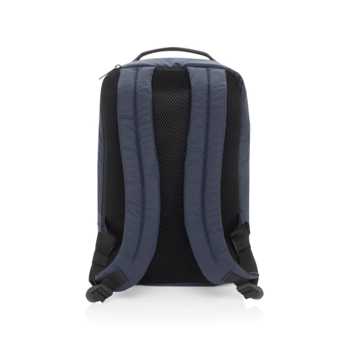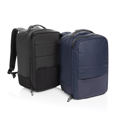 The Armond Aware™ RPET Free On Board Travel Pack is designed for the budget-conscious or short business traveller. Made from rPET with a PU water-resistant coating and backed with AWARE technology, this backpack features a 15 inch padded laptop compartment on the right side, perfect for MacBooks or smaller devices. The interior, lined with rPET, ensures your belongings stay organised, while the adjustable shoulder straps and sturdy webbing handle on top provide comfort and convenience. With a front zipper pocket and a mini trolley compartment complete with an elastic strap, this pack is perfect for business or weekend trips. Its compact size fits under any budget airline seat, so you won't have to worry about extra baggage fees. Made with recycled polyester embedded with the AWARE™ tracer. 2% of proceeds of each product sold with AWARE™ will be donated to Water.org. PVC free.