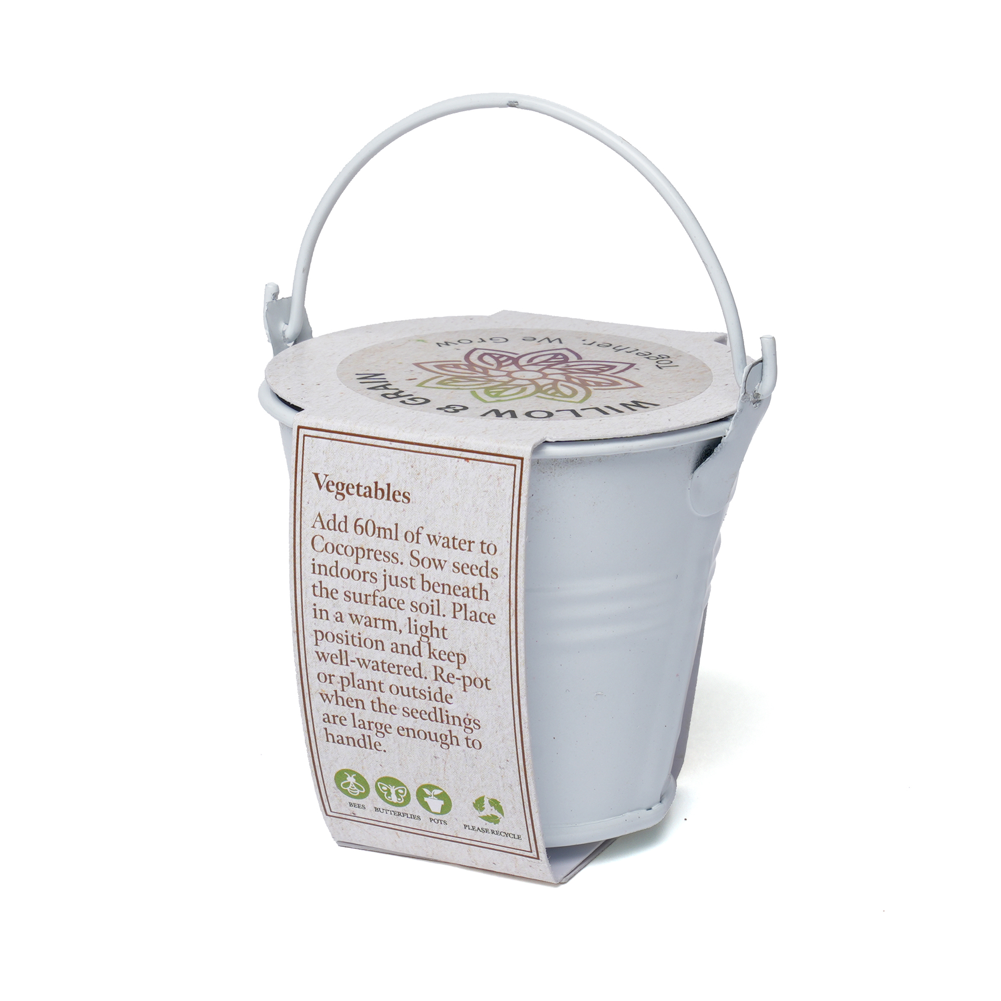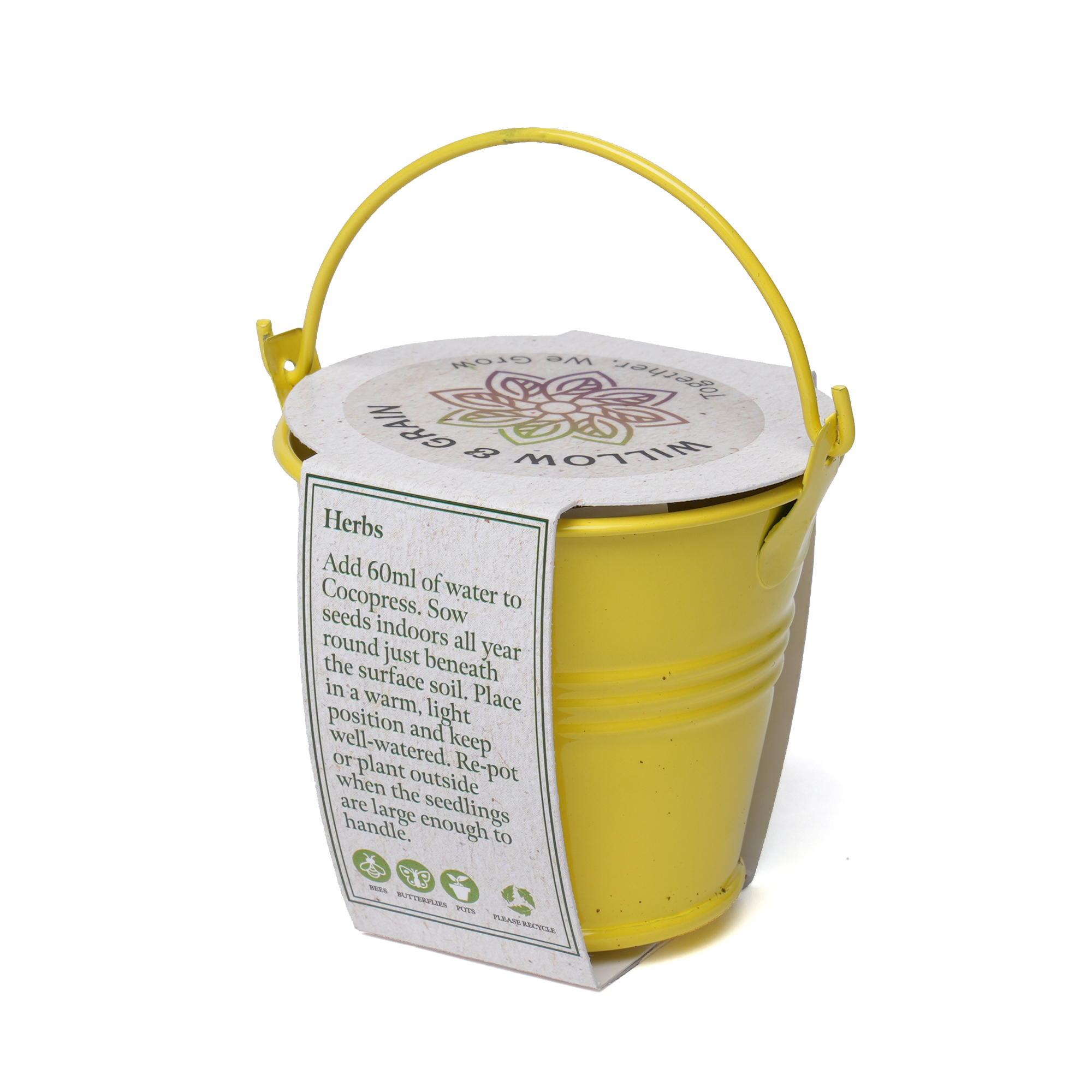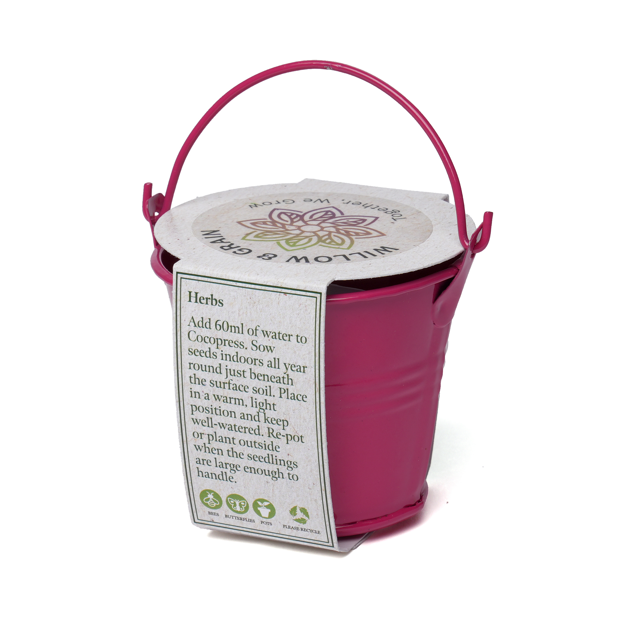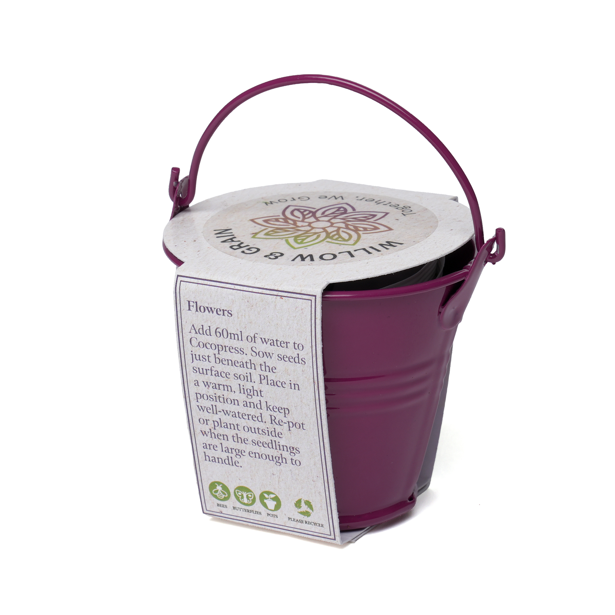 Coloured metal mini bucket with handle, containing a Cocopress® compost tablet and a seed packet (wide variety of seeds available). Supplied with a choice of a Herb, Vegetable or Flower pre-printed sleeve with sowing instructions to the side and features your branding to a label on the top.