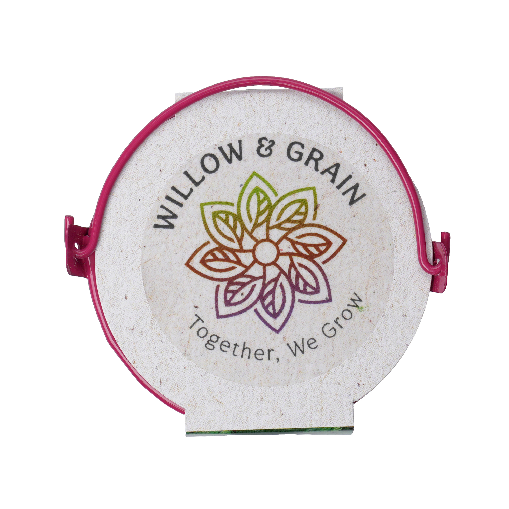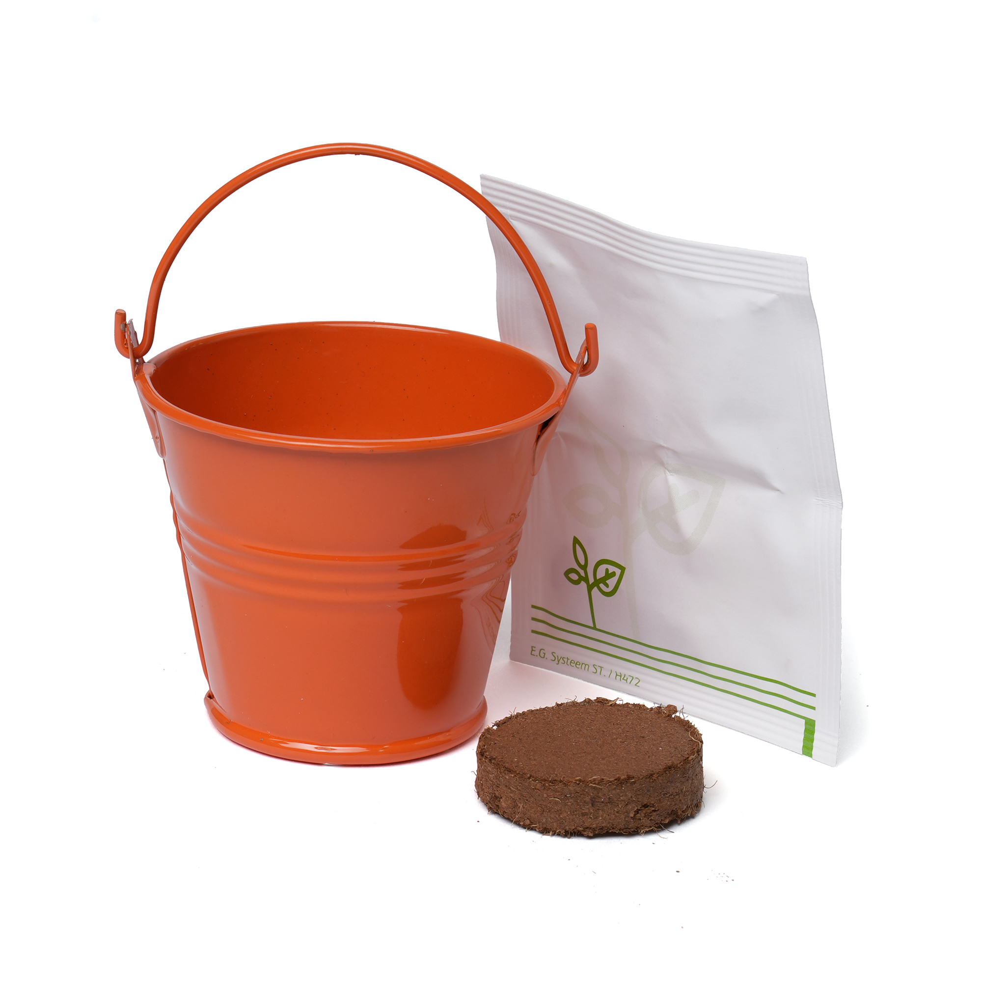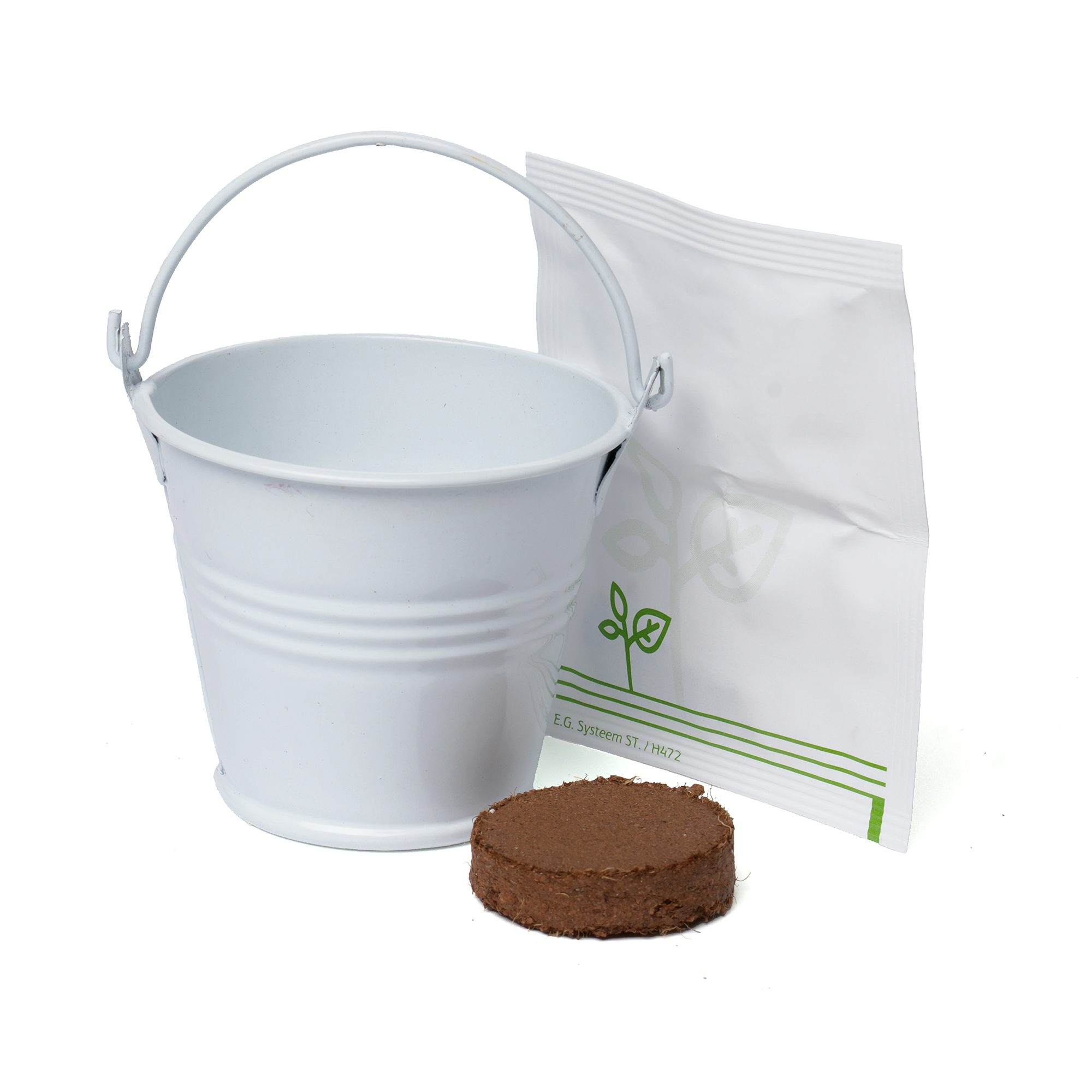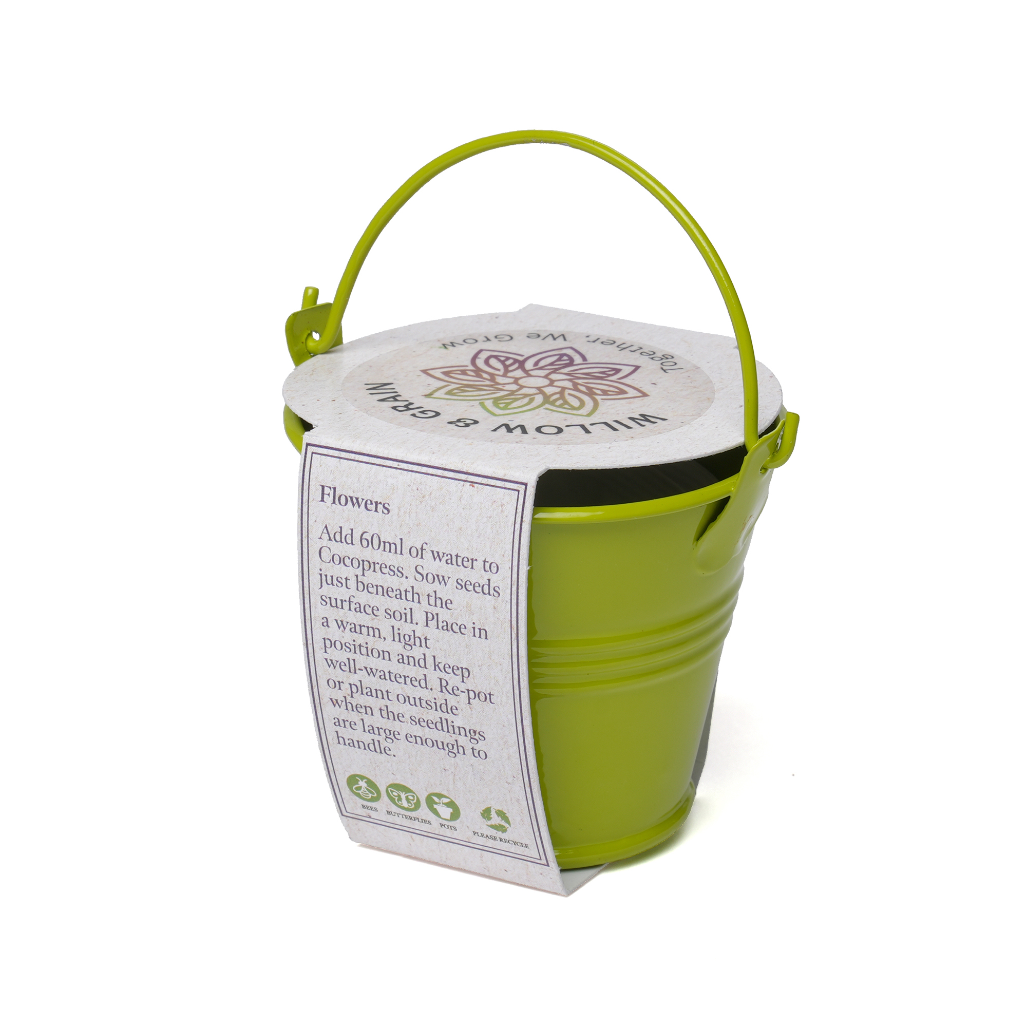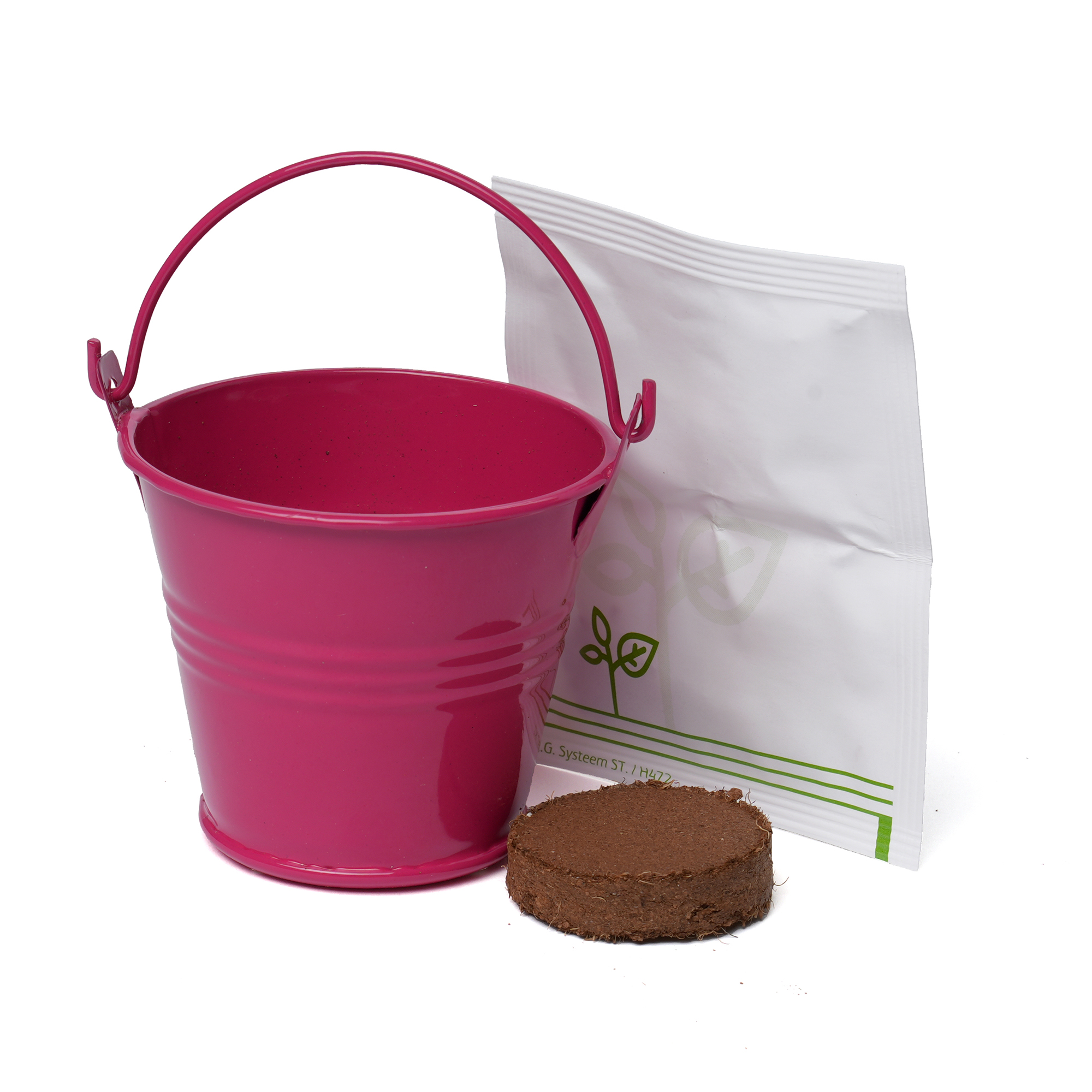 Coloured metal mini bucket with handle, containing a Cocopress® compost tablet and a seed packet (wide variety of seeds available). Supplied with a choice of a Herb, Vegetable or Flower pre-printed sleeve with sowing instructions to the side and features your branding to a label on the top.