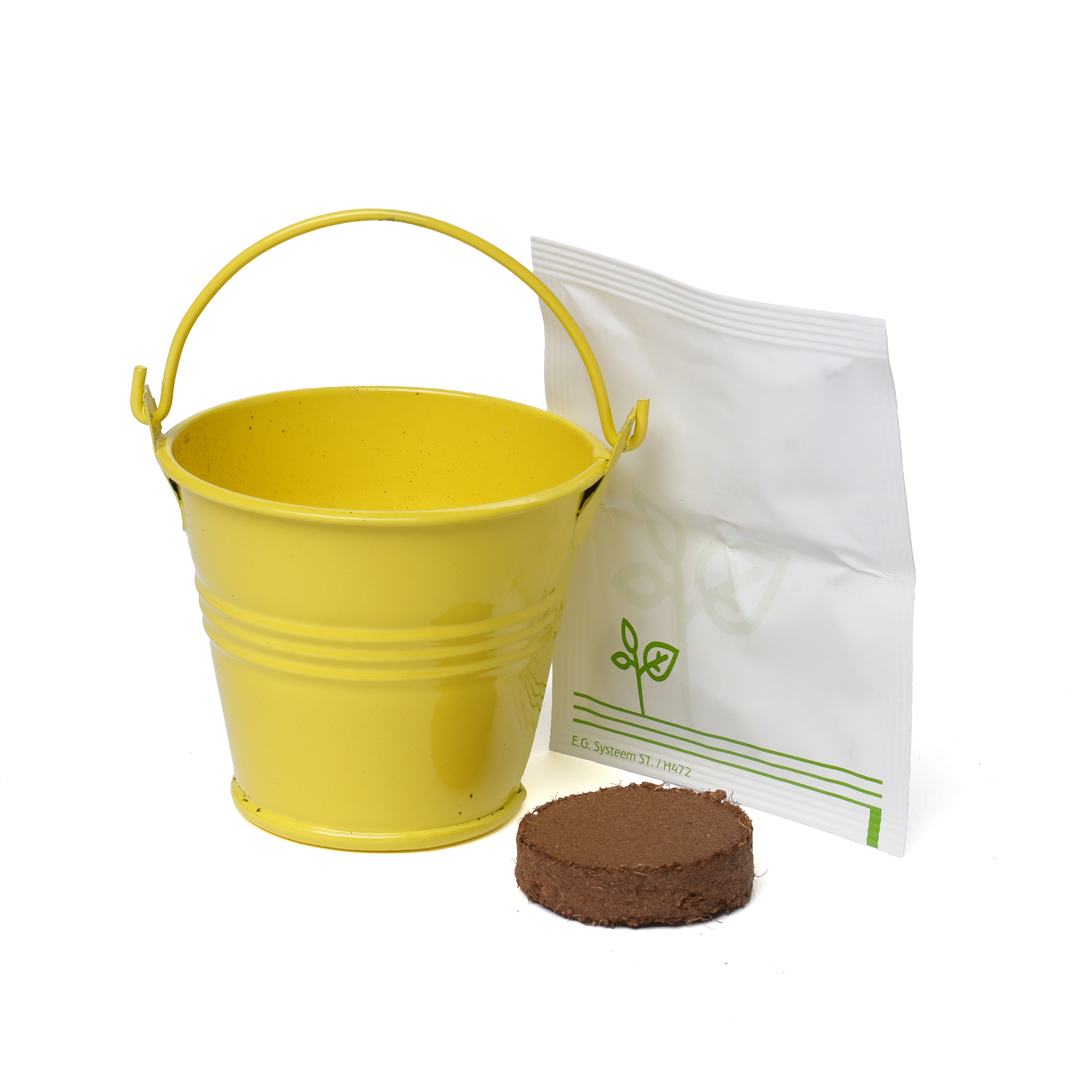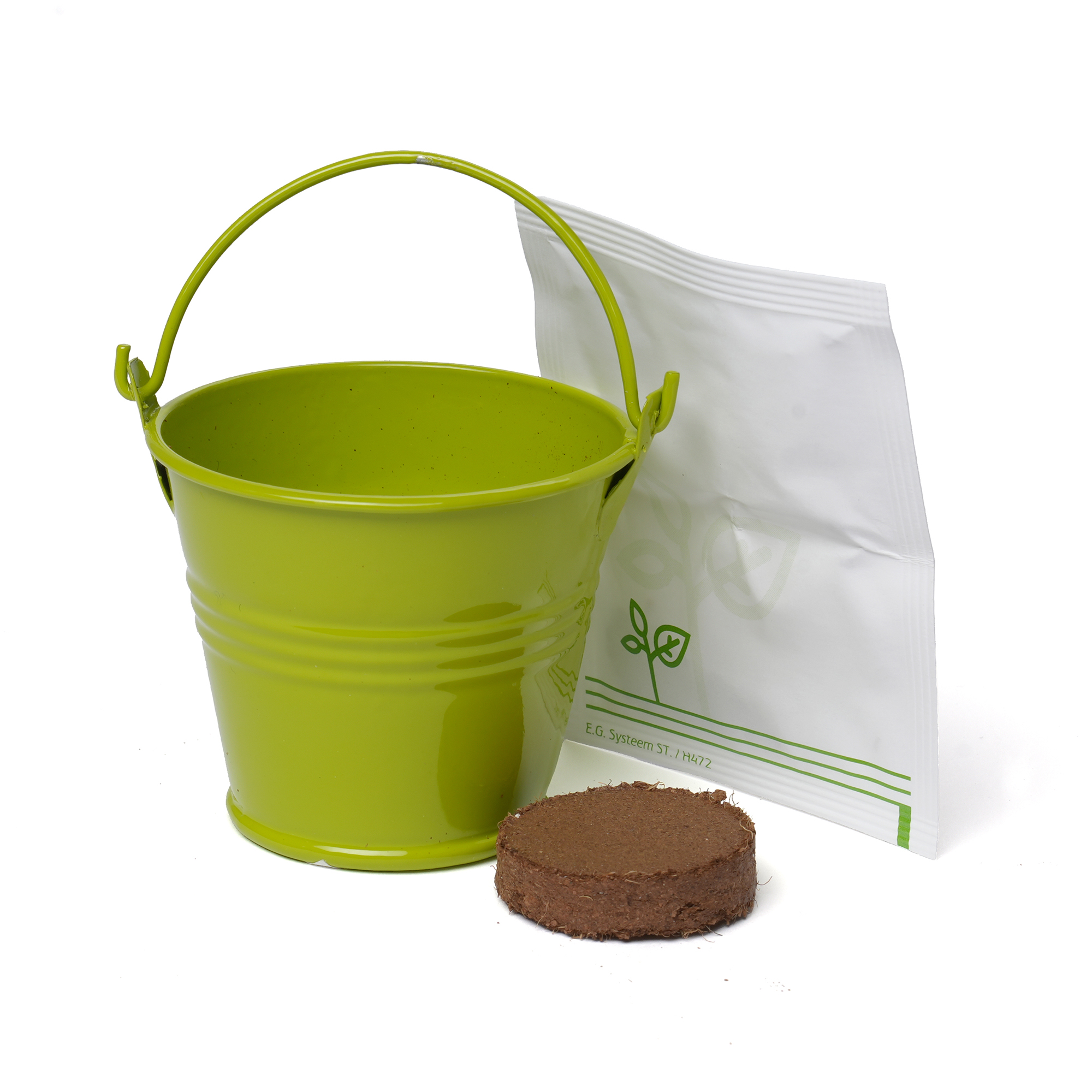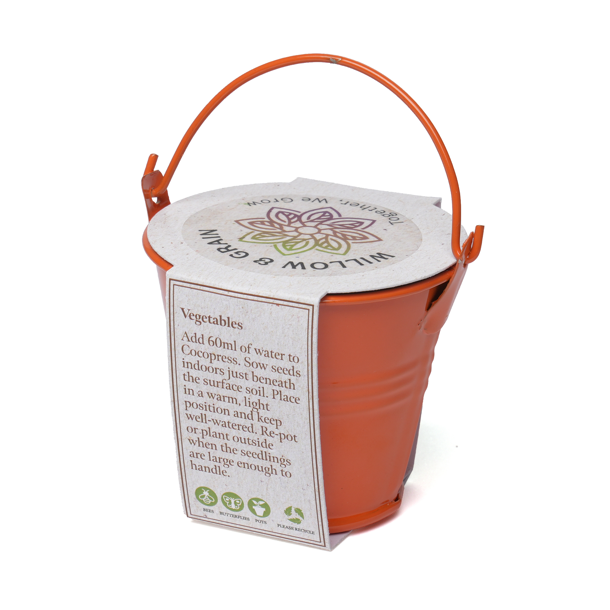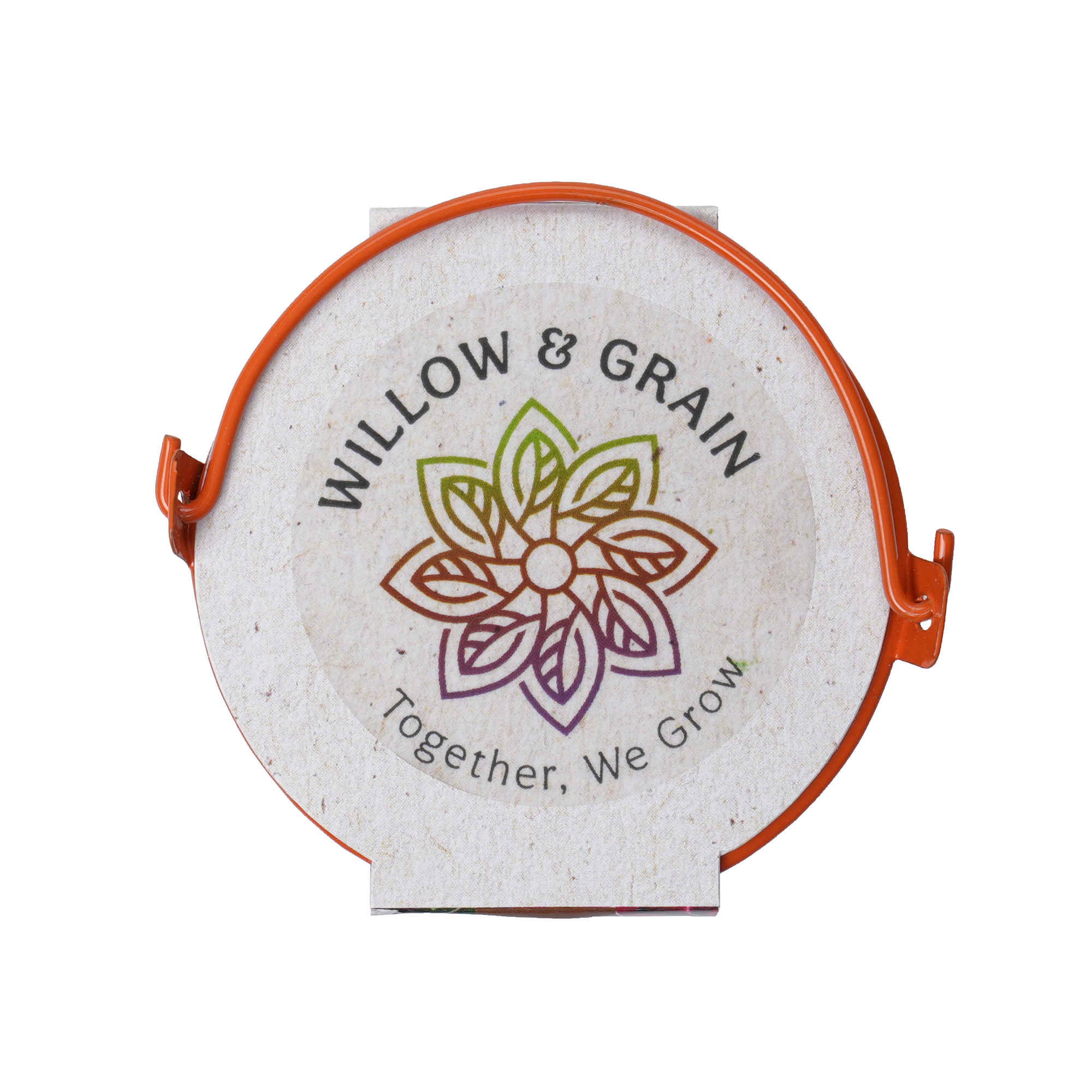 Coloured metal mini bucket with handle, containing a Cocopress® compost tablet and a seed packet (wide variety of seeds available). Supplied with a choice of a Herb, Vegetable or Flower pre-printed sleeve with sowing instructions to the side and features your branding to a label on the top.