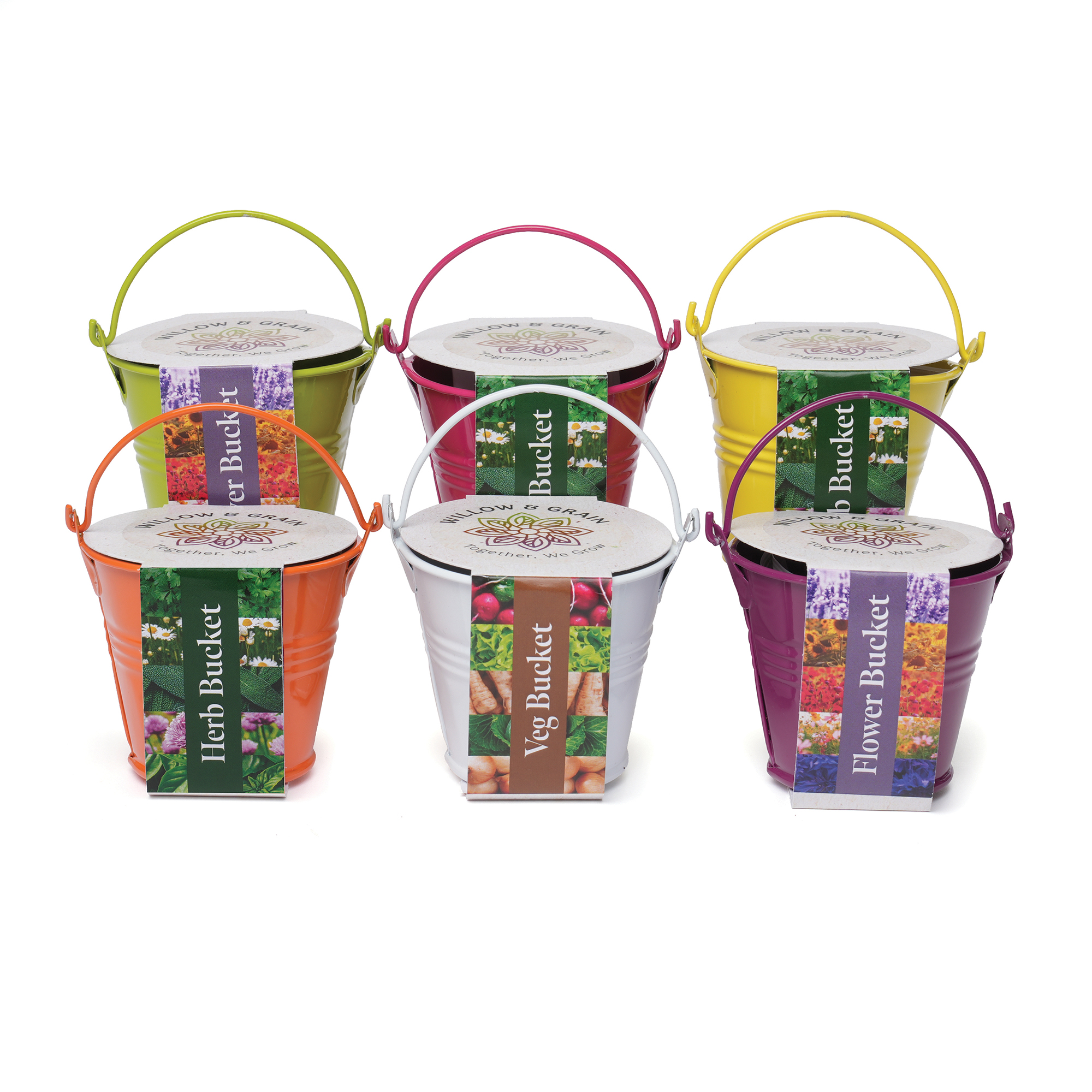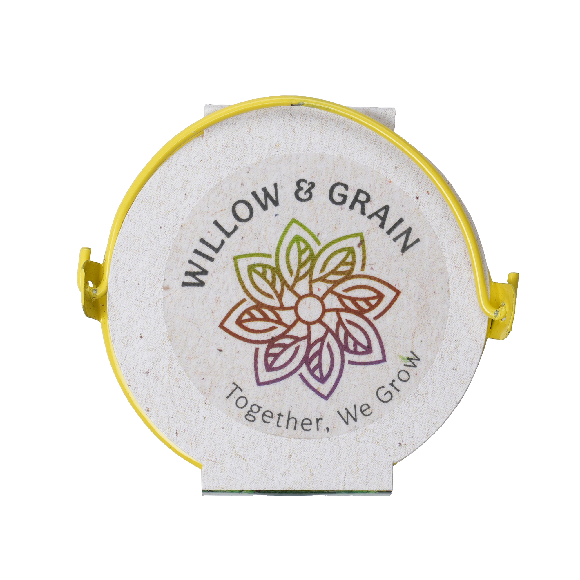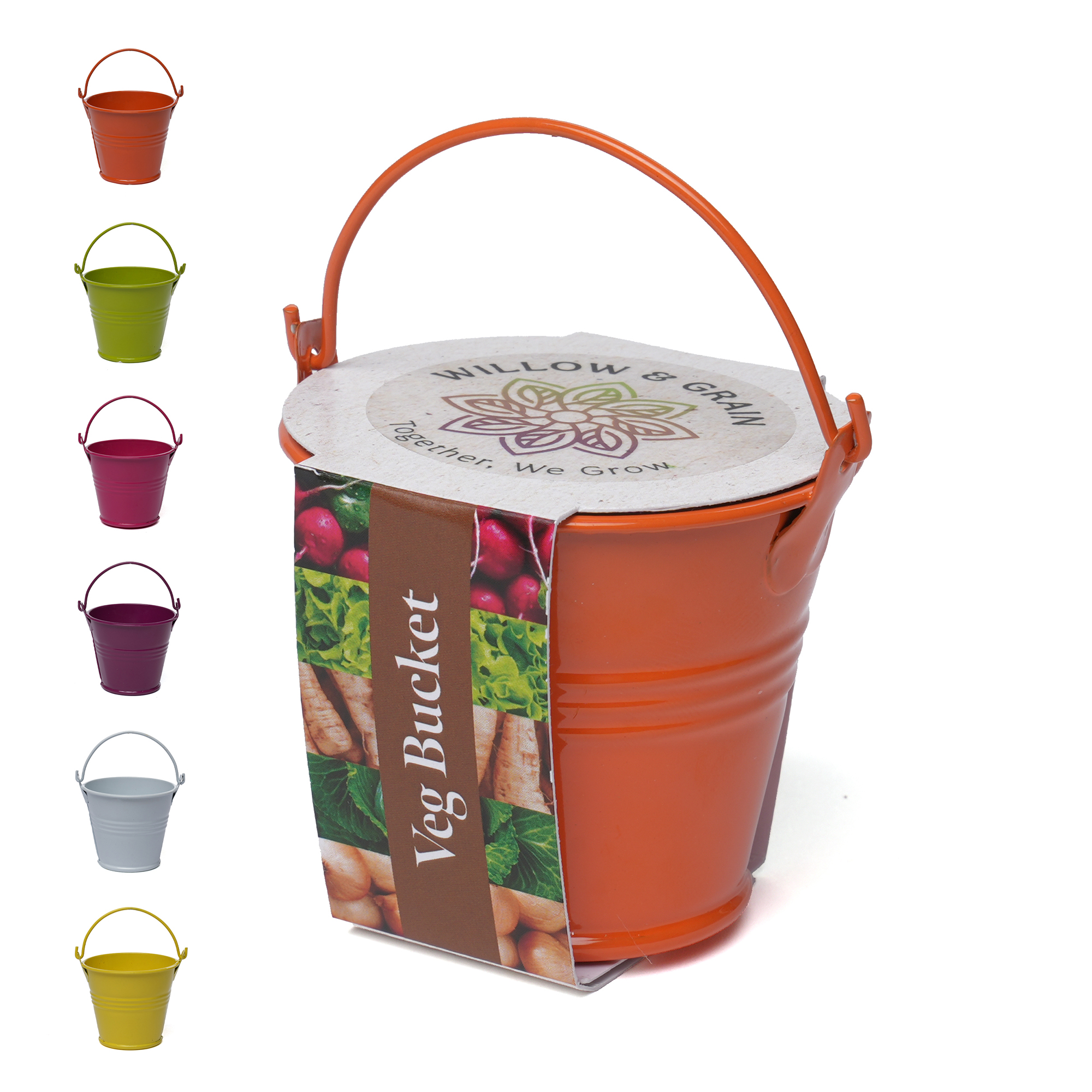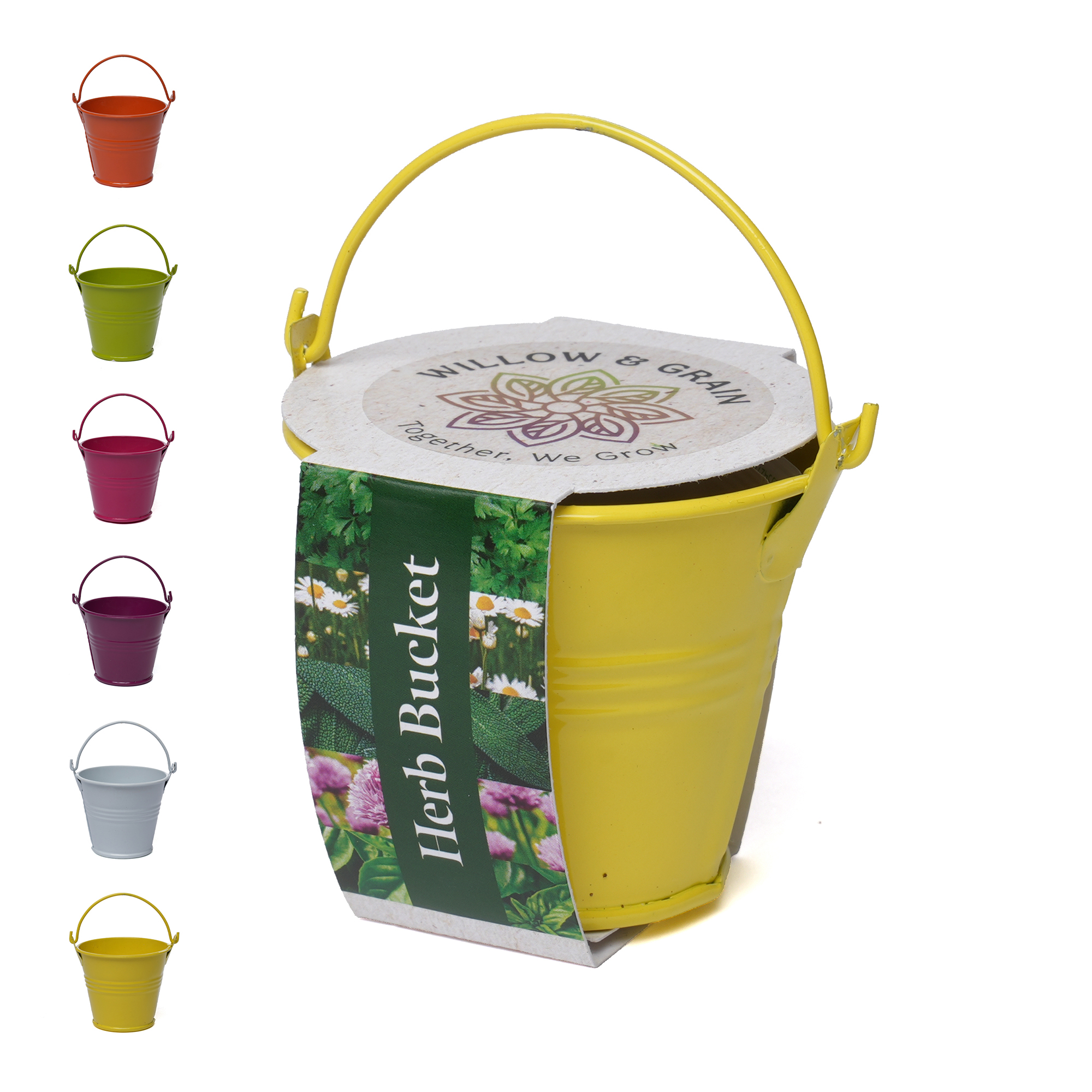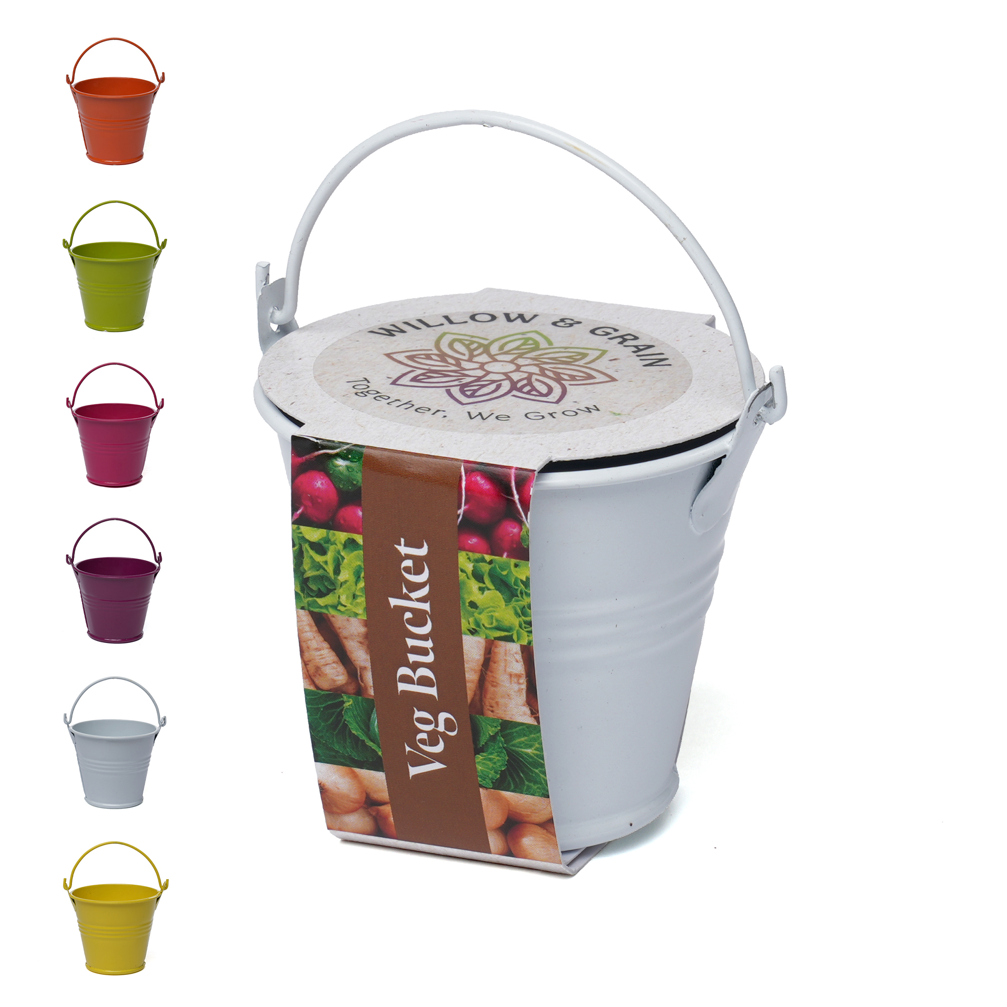 Coloured metal mini bucket with handle, containing a Cocopress® compost tablet and a seed packet (wide variety of seeds available). Supplied with a choice of a Herb, Vegetable or Flower pre-printed sleeve with sowing instructions to the side and features your branding to a label on the top.
