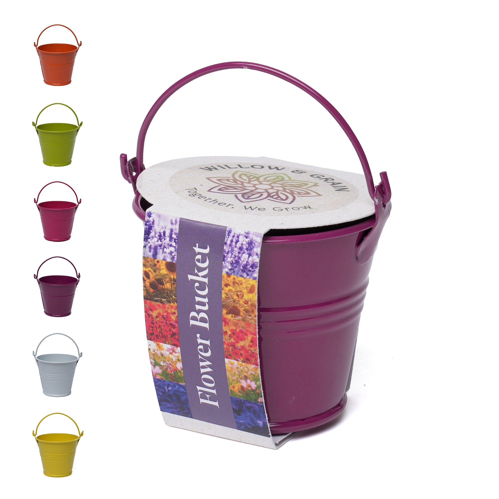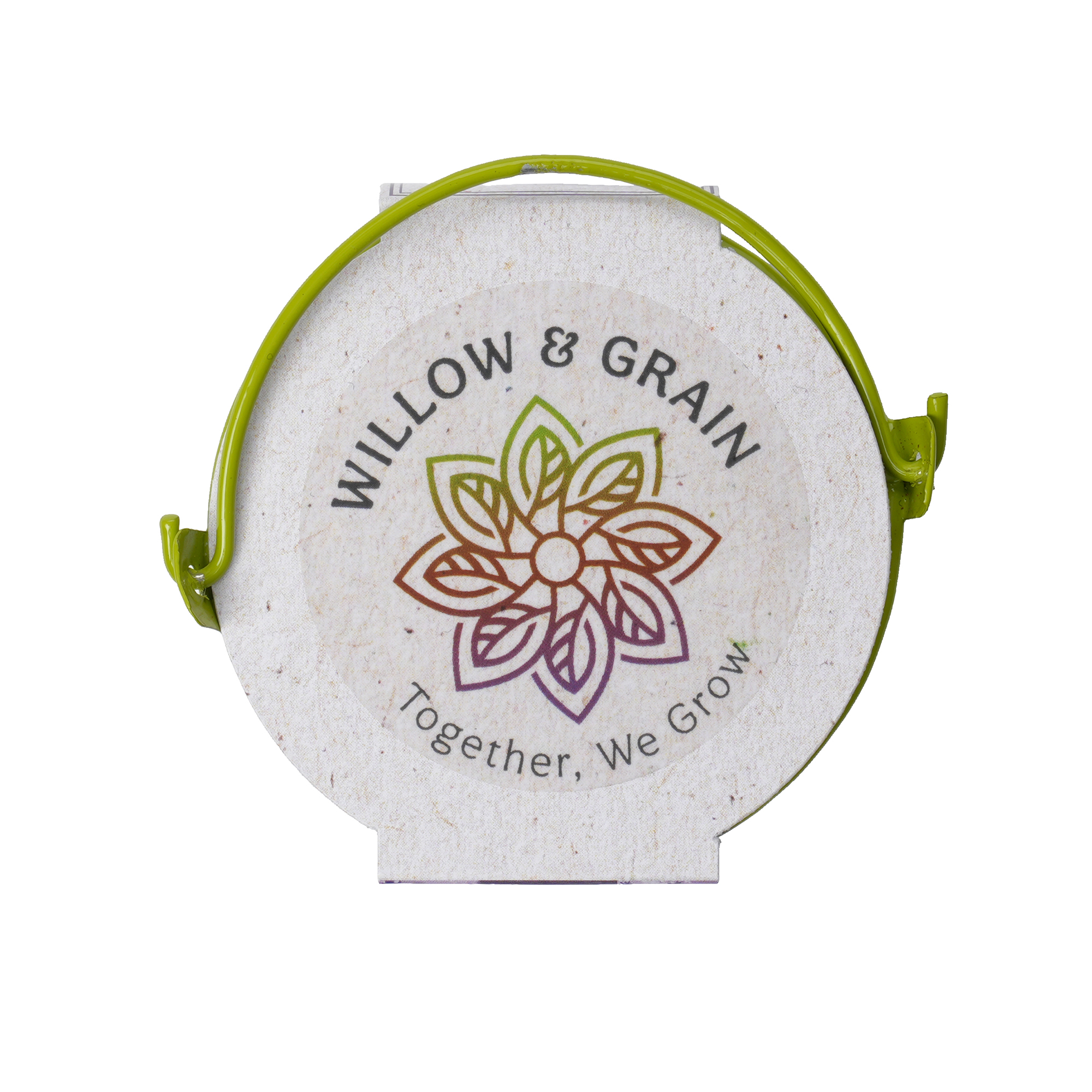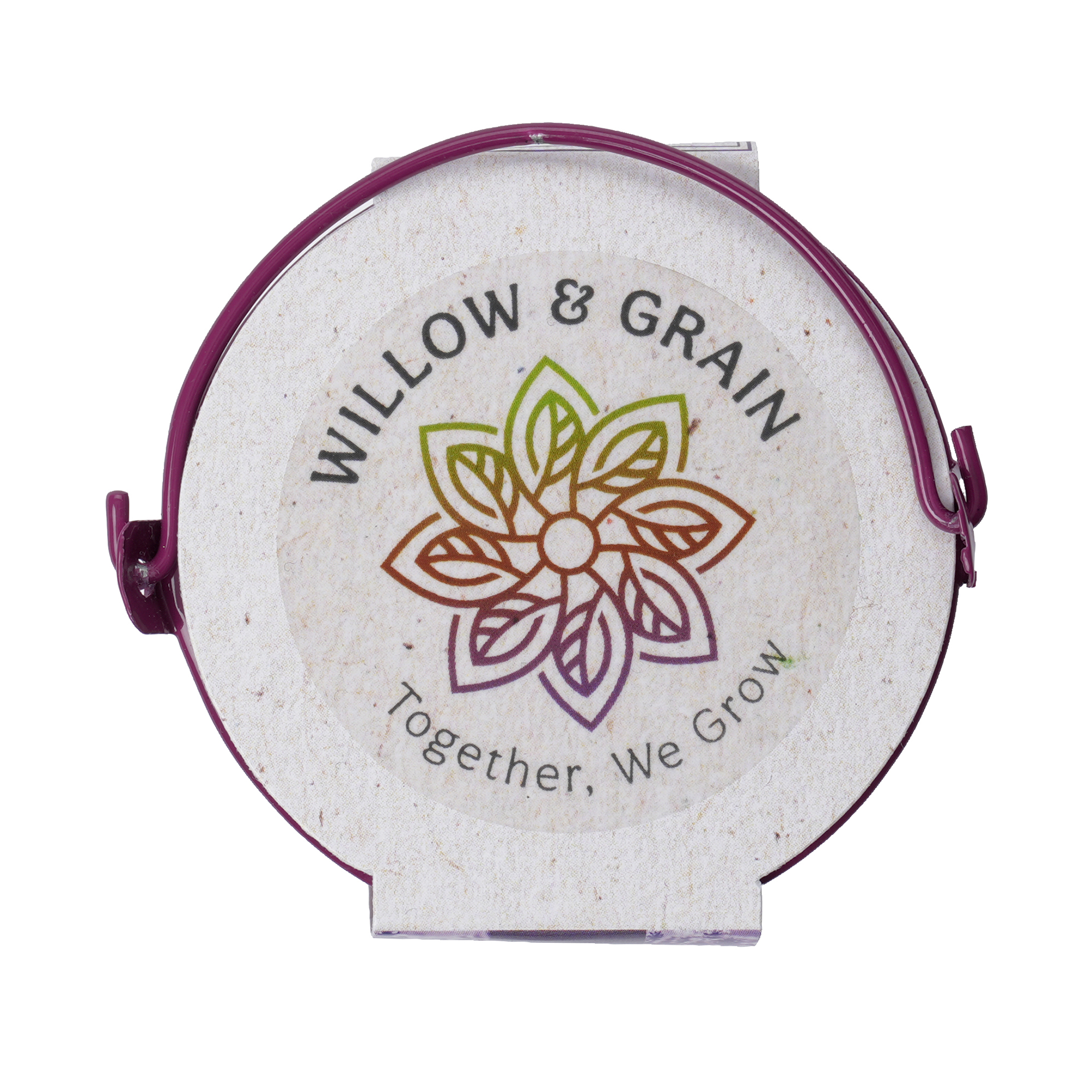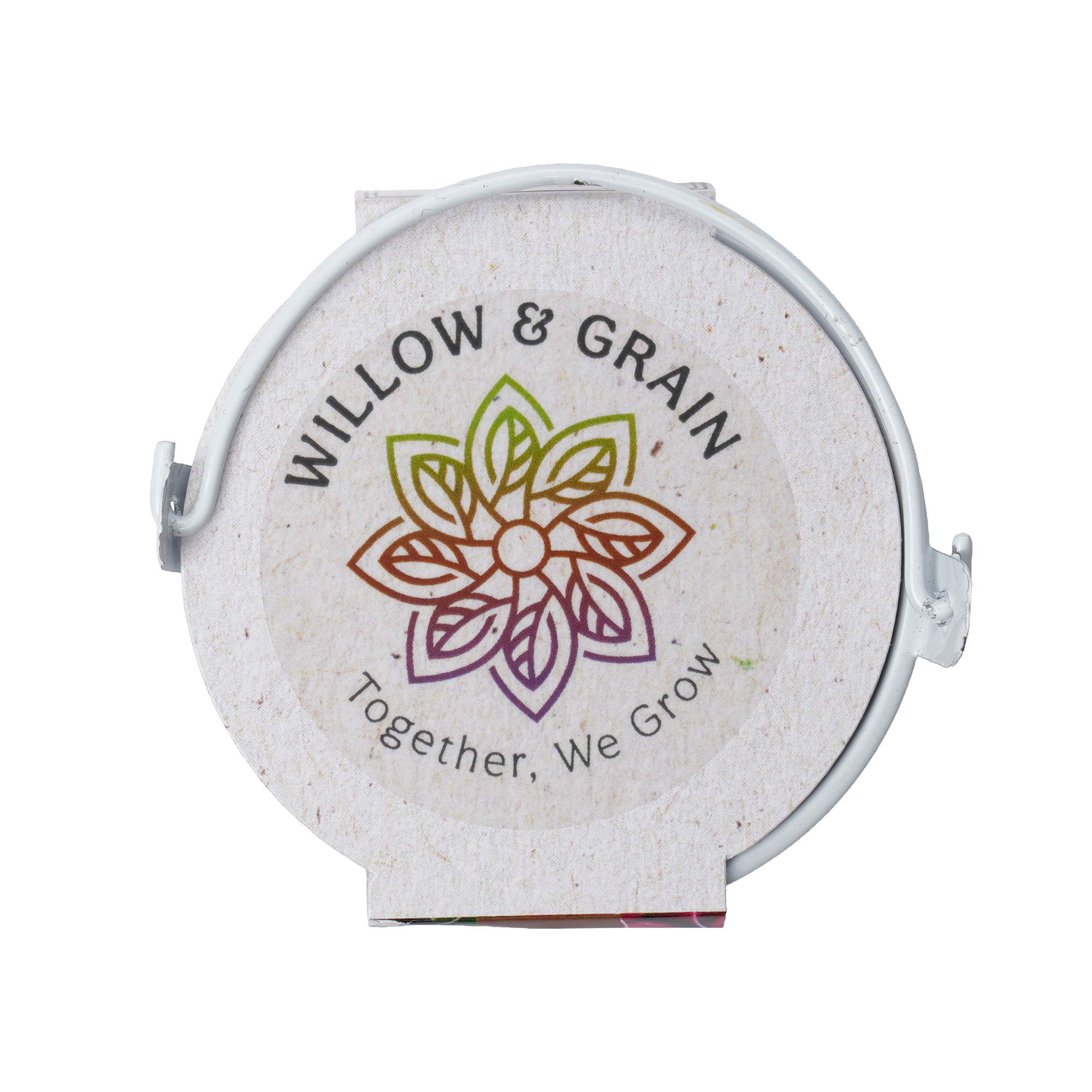 Coloured metal mini bucket with handle, containing a Cocopress® compost tablet and a seed packet (wide variety of seeds available). Supplied with a choice of a Herb, Vegetable or Flower pre-printed sleeve with sowing instructions to the side and features your branding to a label on the top.