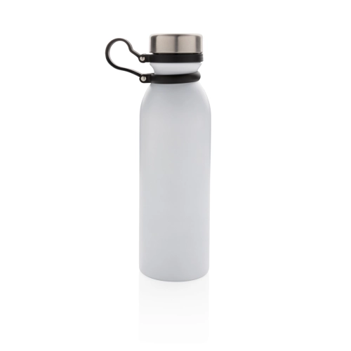 Leakproof copper vacuum insulated bottle with black silicone carry loop. One handed drinking means no need to store or carry the lid. Comes with a double-wall vacuum construction with copper insulation which means it keeps drinks hot for up to 8 hours and cold for up to 24 hours. The construction prevents condensation on the outside of the bottle. Content: 600 ml.