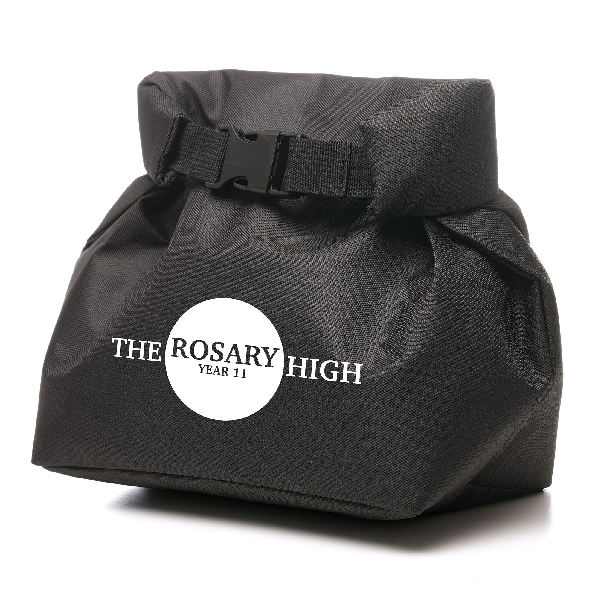 Compact roll down cooler bag crafted from PET plastic, featuring an aluminium lining to maintain cool temperatures and a secure PP plastic buckle. Includes a large area for branding.