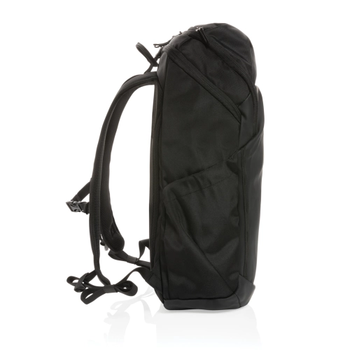 Swiss Peak AWARE™ RPET 15.6 inch business backpack is a weather-resistant backpack for work and everyday adventures. The backpack features a roomy main compartment and on-the-go quick access to your laptop via the side zipper. Comfortable to wear thanks to the contoured, breathable shoulder straps, padded back panel and fully adjustable chest trap. A top zipper pocket holds all your daily essentials. The exterior is made with PU and 1200D recycled polyester. The lining is made with 100% 150D recycled polyester. With AWARE™ tracer that validates the genuine use of recycled materials. Each bag has reused 38.19 0.5L PET bottles. 2% of proceeds of each product sold containing AWARE™ will be donated to Water.org.