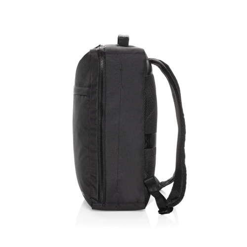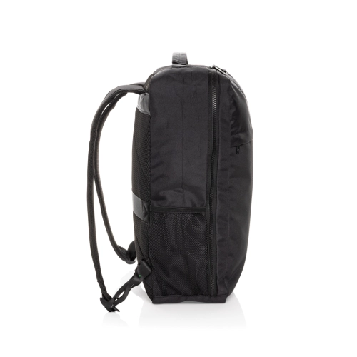 The Swiss Peak Aware™ RPET Essential 15.6 Inch Laptop Backpack is designed to meet your everyday business needs. Made from 100% rPET, this sleek and durable backpack features a main zipper compartment with a dedicated laptop section that fits modern 15.6-inch laptops, along with a mesh zipper pocket and care label inside. The adjustable shoulder straps with buckles ensure a comfortable fit, while the front zipper pocket and side drink holder pocket provide additional storage. The bag also features a convenient luggage strap on the back and a webbing handle on top for easy handling. The tonal Swiss Peak logo and premium Swiss Peak zippers complete its professional look.Made with recycled polyester embedded with the AWARE™ tracer. 2% of proceeds of each product sold with AWARE™ will be donated to Water.org. PVC free.