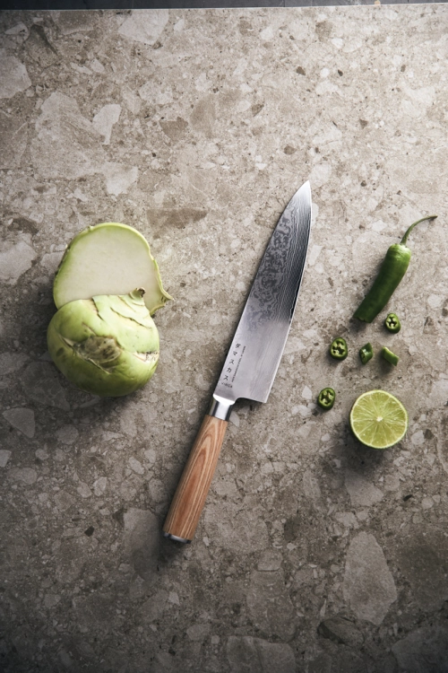 This chef's edition knife is ideal for cutting meat and larger vegetables or chopping herbs. The sturdy pakkawood handle is ergonomically designed, making the knife easy and comfortable to use. This means you can work with the knife for a long time without tiring your hand. The blade has an incredibly hard core of VG10 steel which is cast in 67 layers of steel. The result is a durable blade with an incredible sharpness and outstanding cutting performance.