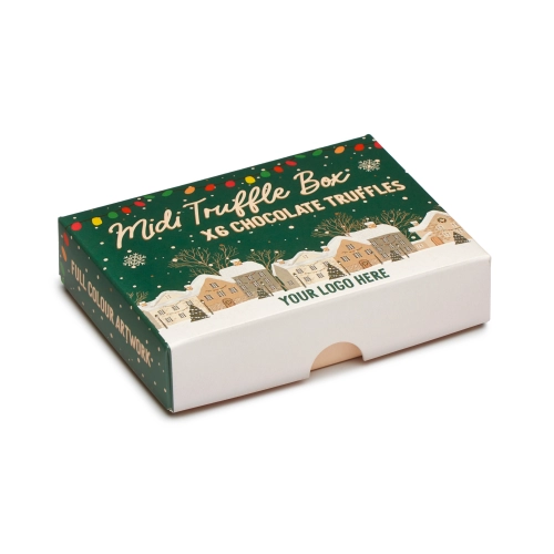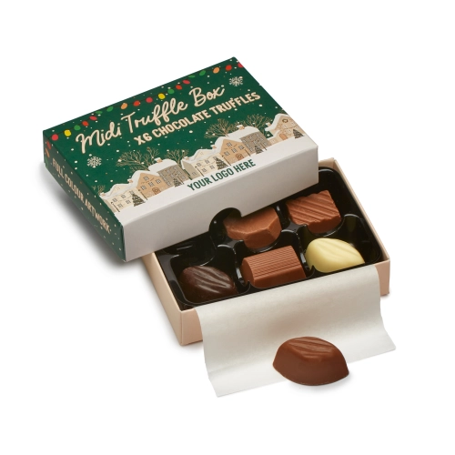 Unwrap the magic of the season with our Midi Truffle Box. Nestled inside, you’ll find 6 rich chocolate truffles that promise a burst of festive flavour with every bite. 🎄 Choose from 7 Tasty Truffle Flavours! Made using Sustainable Cocoa these truffles are perfect for adding a touch of seasonal cheer to any promotional campaign. With Compostable & Eco-Friendly Packaging your gifting is as sustainable as it is delightful.